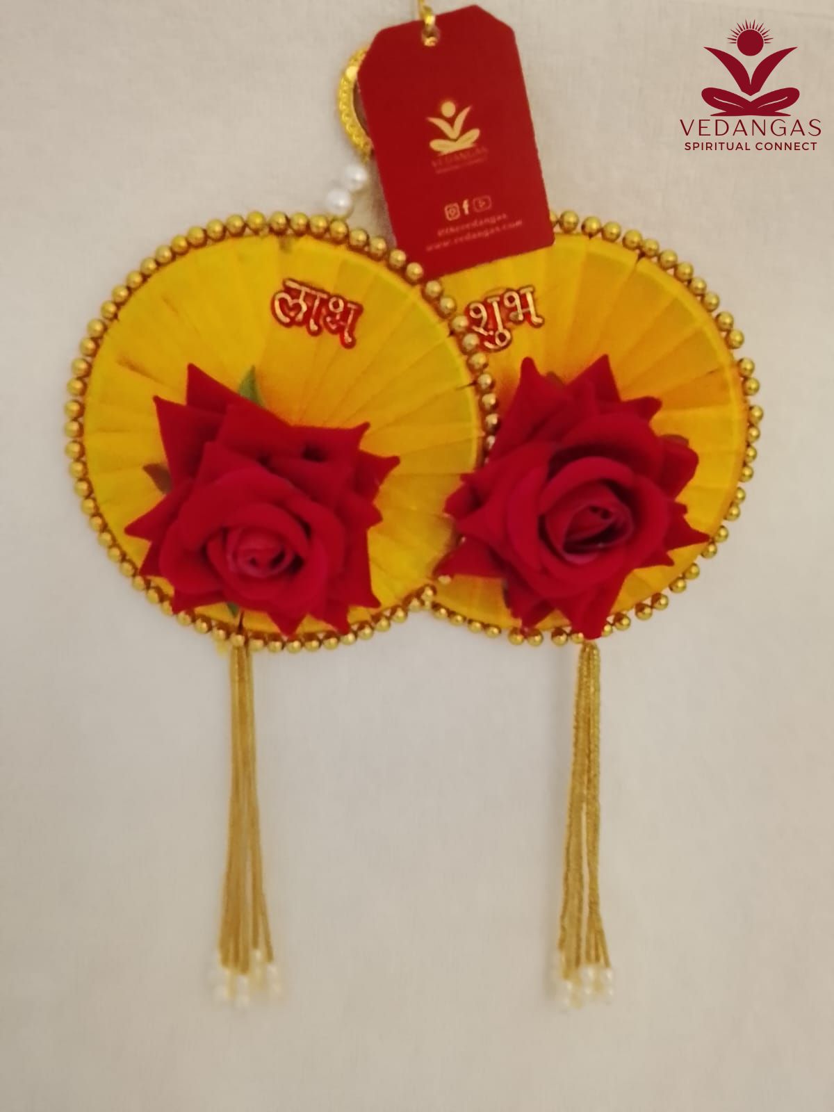 Using the Vedangas Shubh Labh Wall Hanging, invite divine blessings and prosperity into your home. This beautiful hanging with gold accents, red floral highlights, and pearl tassels is the perfect combination of tradition and dazzle.